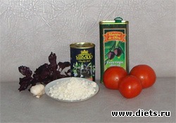 3. Базилик (листья) нарезать не очень мелко. Перемешать все компоненты, добавить оливковое масло.