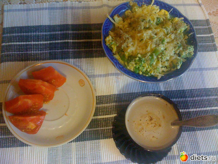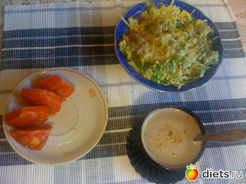 Завтрак мой состоял из ковбойского омлета. Это капуста брокколи и омлет из 2 яиц с обезжиренным молоком. Помидора 4 кусочка и напиток Галка с молоком.