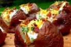 Сделать на картофелинах по большому крестообразному разрезу, влить чесночное масло, размять мякоть вилкой. Сверху положить начинку.