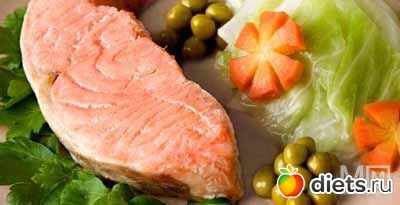 3. При подаче на блюдо уложите порционные куски рыбы, рядом выложите гарнир: зеленый горошек, припущенные капусту и морковь. Полейте гарнир приготовленной заправкой. Оформите рыбу веточками зелени.