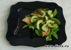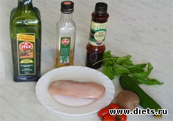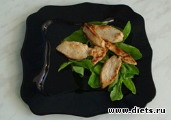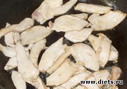 1. Куриную грудку нарезать тонкими ломтиками. Смешать по одной столовой ложке винного уксуса и соевого соуса. В полученный маринад положить курицу на полчаса. Затем обжарить грудку на сковороде с парой ложек оливкового масла по 2-3 минуты с каждой стороны до появления золотистой корочки.