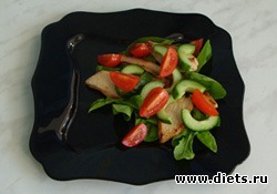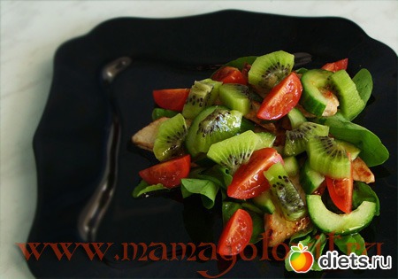 5. Помидоры черри разрезать на четыре части и выложить поверх огурцов. Киви очистить, удалить сердцевину, нарезать кусочками аналогично огурцу. Смешать оставшийся уксус, соевый соус и 2 ст. л. оливкового масла. Заправить салат.