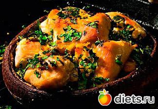 Окунуть в полученную смесь шляпки грибов, уложить их на противень, посолить, поперчить. Филе нарезать кусочками, посолить, поперчить и разложить по шляпкам. Сбрызнуть маслом и поставить в разогретую до 230°С духовку.