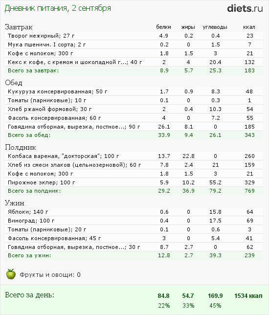 Дневной рацион так себе, были у родителей, очень голодна была. Вечером покушала немного мяса с овощами и фруктами. Планировала в 8, но небольшая авария спутала планы.