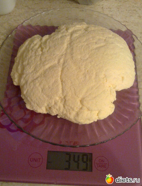 В моем случае из 1 литра молока получилось около 400 грамм сыра (может быть чуть больше или меньше, в зависимости от того, как сильно и долго отжимать под прессом).
