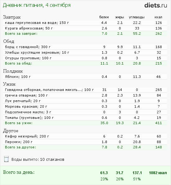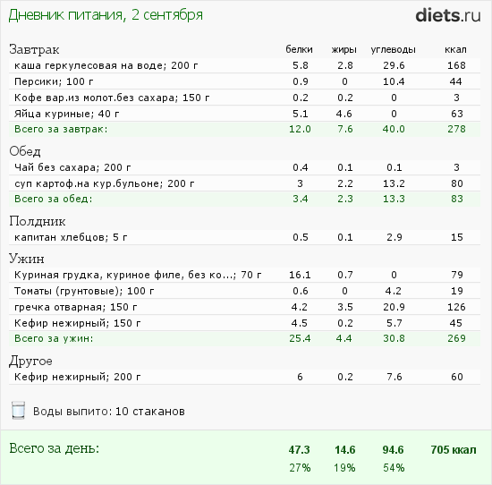 Теперь, очень важное. Где у Вас жиры? Их нет практически совсем. За два дня едва наберется пяток граммов жира. Разве так можно? Жиры - очень существенный компонент рациона, без них ни гормоны организм не построит, ни кожу, ни волосы. Желчь без жиров не образуется, хороший холестерин тоже. Жиры должны составлять хотя бы 20-25% калорийности рациона!