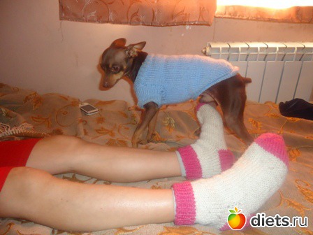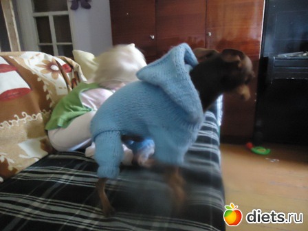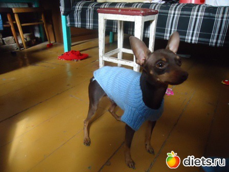 , а тут захотелось завести себе какое нибудь занятие для души, да ещё мелкий пёсик мой трястись начал от холода, вот с него я и начала вязать.
