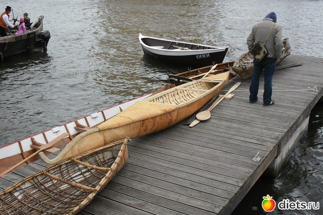 Там была выставка разных лодок из разных стран - финские, норландбот, наши омолонка, берестяная, кижанка и еще много, но я хочу вам показать наш, сделанный калининградцами куренас. Это лодка пруссов и древних куршей, наши её воссоздали, ну и видите, танцуют от радости. Костюмы не знаю, чьи.