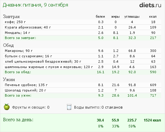Ради интереса покажу вам свою менюшку вчерашнюю. Виноград не записала, потому, что не взвешивала - ходила, воровала его потихоньку, ну и наворовала грамм 100, наверное!