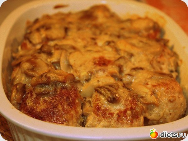 Залить грибным соусом курицу, накрыть форму крышкой или затянуть фольгой и отправить в разогретую духовку на 15–20 минут, затем снять фольгу, присыпать сыром и запекать еще 5 минут, чтобы получилась золотистая корочка. Кому сыр еще нельзя - можно обмазать натуральным йогуртом.