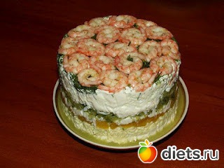 6 слой - мелко нарезанные персики консервированные (можно и ананасы) сетка майонеза.