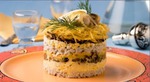 Салат можно подавать в виде порционных тортиков, сформовав их с помощью цилиндрической формочки. При подаче оформите по желанию.
