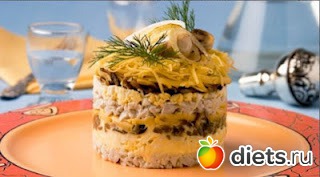 На блюдо выложите слоями в следующем порядке: половина куриной массы, половина яиц, половина грибной массы, сыр, натертый на крупной терке. Слои повторите в том же порядке, последним слоем выложив мелко натертый сыр. Выдержите торт в холодильнике 2 часа.