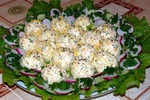На подготовленный овощной салат выложить творожные крокеты, посыпать тёртым желтком и тмином.