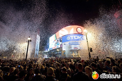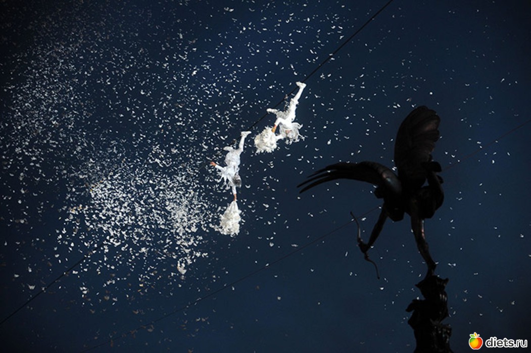 15. Артисты, одетые в ангелов, разбрасывают перья над площадью Пикадилли. (Matt Grayson/PA)