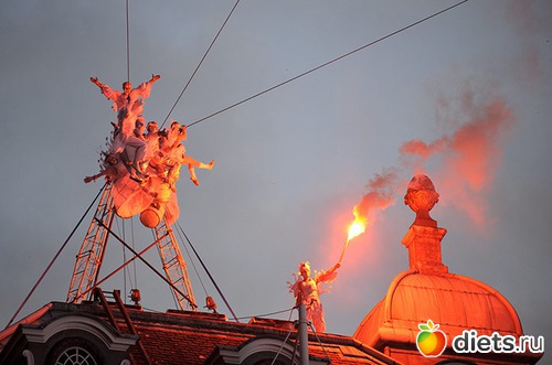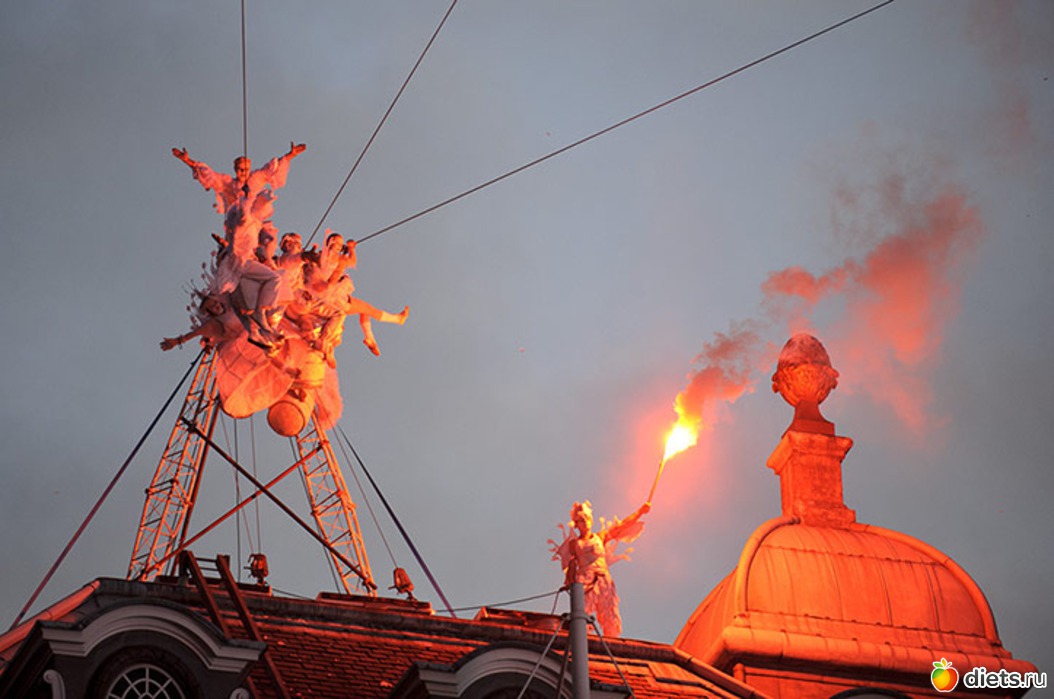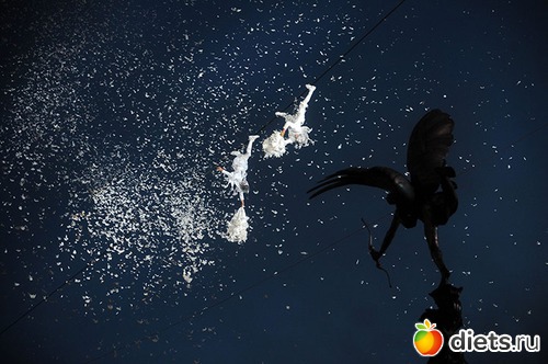 17. На закате кульминационное драматическое выступление в воздухе. Артисты французского театра Les Studios de Cirque разбрасывают перья. (Ray Tang/Rex Features)