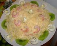 Затем смешать йогурт с майонезом, немного подсолив по вкусу. Теперь когда все продукты и заправка подготовлены, выкладываем в салатницу ананас, тертые яйца, затем измельченные креветки и на самый верхний слой - тертый сыр, прослаивая каждый из них приготовленной заправкой. Сверху салат можно украсить листиками зелени, несколькими креветками и кусочками яйца.