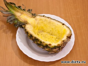 Выложить салат в половинки ананаса.