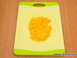 Апельсин почистить, удалить пленочки, нарезать небольшими кусочками.
