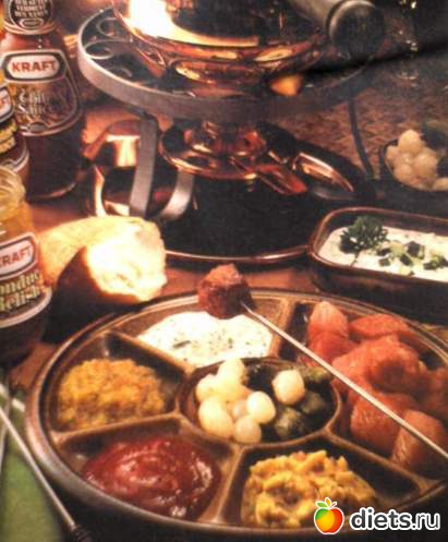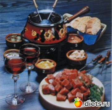 Мясное фондю, или фондю бургийон, для холодных зимних вечеров, подается с острыми растертыми до пастообразного состояния салатами, крестьянским белым хлебом и обязательно с красным сухим вином.