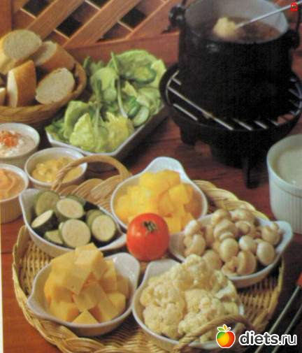 И все-таки я начала осваивать швейцарскую и заодно французскую кухни. Для начала подошли разнообразные фондю. Благо готовить надо было немного салатов остальное готовилось прямо за столом:-) А как располагает к общению живой огонь на столе!!!