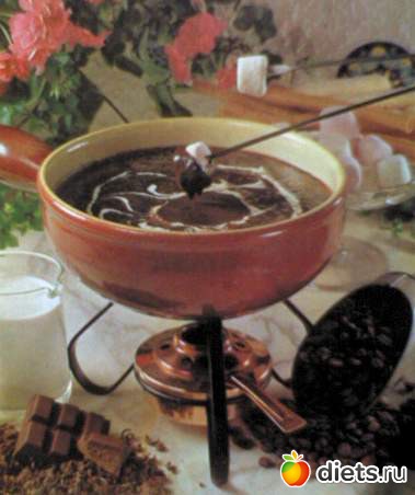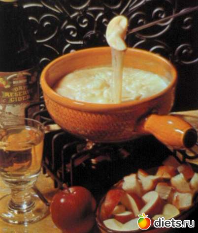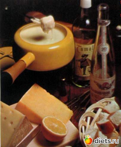 Варится сыр, лучше нескольких сортов в кастрюле, желательно чугунной с толстыми стенками, вместо воды – белое сухое вино, и к столу подается вино именно того сорта, в котором варился сыр. Все вооружаются вилками на длинных ручках и просто зачерпывают эту кашу маленькими кусочками хлеба, но не только.
