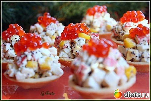 4. Тарталетки с начинкой с крабовых палочек, плавленого сырка, с зеленью под майонезом (картинки правда похожей не нашла)