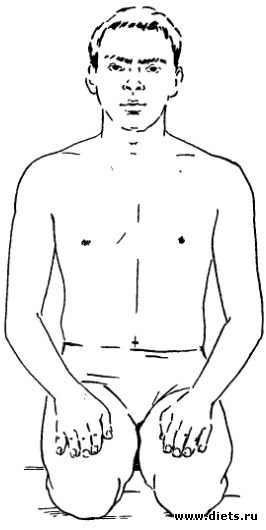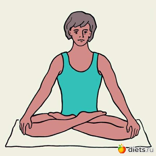 Сесть на коврик, подтянуть обе ноги к туловищу. Руками плотно обхватить ноги у лодыжек, ступни прижаты друг к другу. Если сможете, правой рукой возьмитесь за наружную левую лодыжку, а левой рукой за запястье правой руки. Если не сможете это сделать, то соедините крепко пальцы рук. Голову приблизить к коленям