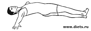 вдох: положите правую пятку между первыми двумя пальцами левой стопы. выдох: поверните ноги и стопы влево. Сохраняйте ноги напряженными, а плечи – на полу. Голова вправо