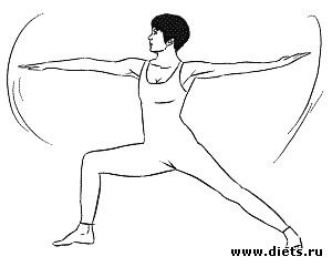 Выдохните, когда ставите левую ступню вперед, ступни на ширине бедер