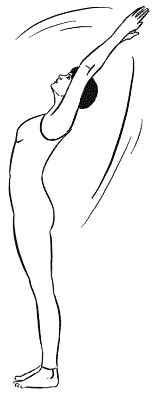 Вдохните и поднимите руки до уровня плеч. Держите руки разведенными в стороны, растягивая их от туловища до кончиков пальцев и ощущая напряжение в области подмышек. Поверните голову и слегка наклонитесь назад, чтобы смотреть поверх кисти