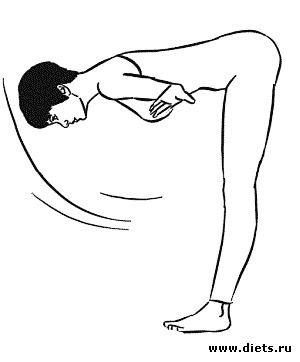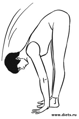 Выдохнуть, когда сгибаете колени и вытягиваете свое туловище вперед и вниз по направлению к полу. Руки в стороны и вниз. Потянуть и выпрямить позвоночник