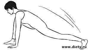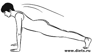 Вдохнуть и опустить бедра вниз, пока торс не станет прямой линией от головы до ступней. Руки сильные и прямые
