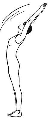 Вдохнуть, когда разводите руки в стороны и поднимаете их вверх над головой круговым движением большой амплитуды. Держим локти прямо и позади ушей, ладони направлены друг на друга. При каждом вдохе опираемся на пятки и слегка втягиваем пупок, чтобы освободить крестец и опустить вниз копчик. Одновременно поднимаем грудину вверх и внутрь тела, прогибая грудную клетку вверх. Когда крестец движется вниз, а грудная клетка поднимается, плечи и руки растягиваются вверх и назад.