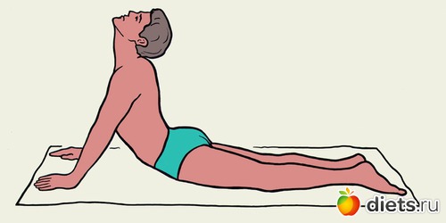 Вдохните, когда скользите вперед вдоль пола. Напрягите ноги и ягодицы. Держите локти близко к телу, когда отрываете от пола голову, шею и грудную клетку, прогибаясь вверх