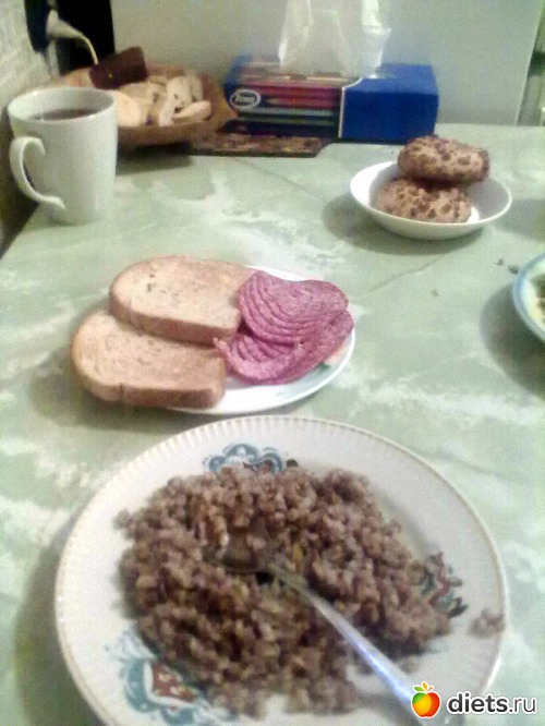 вот мой типичный завтрак, из каши я обычно съедаю ложек 5-6, потому что пока я копаюсь, она превращаеся в нечто ужасное