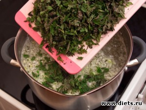 Следом добавить крапиву, варить до готовности картофеля (5-7 минут).