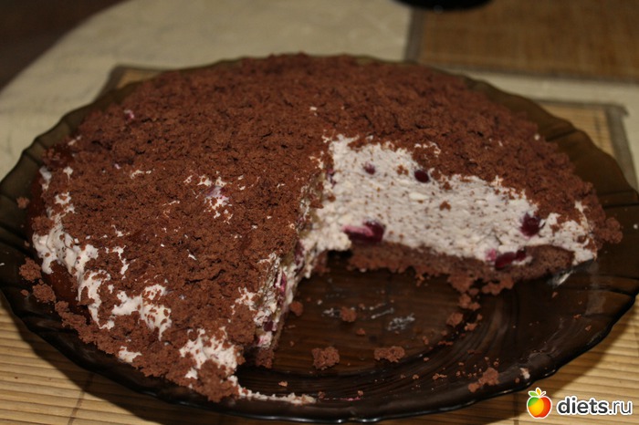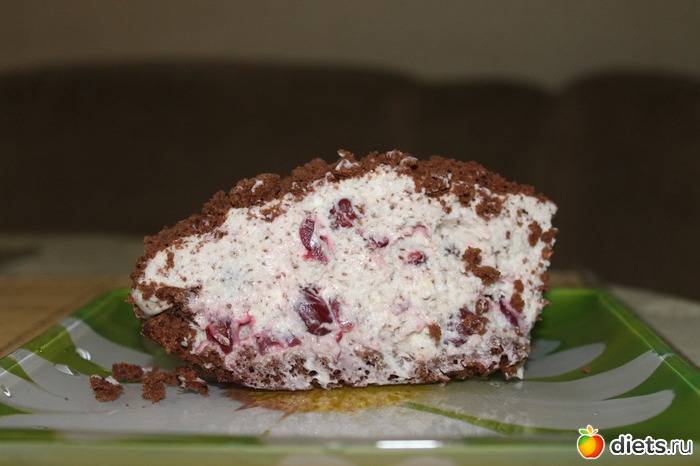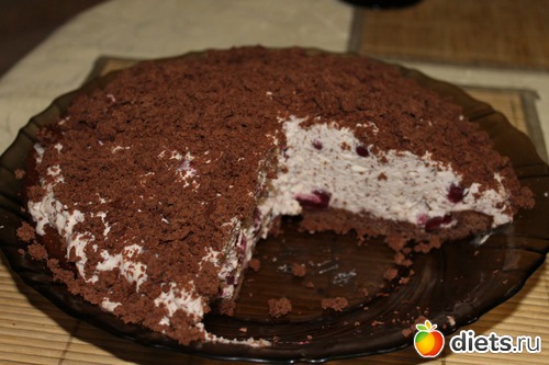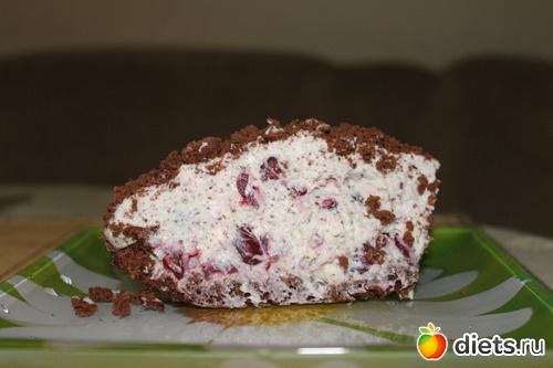 Торт выглядит как шоколадная горка... А в разрезе видно, что внутри белое нежное суфле из маскарпоне с вишнями... Очень вкусно!!!