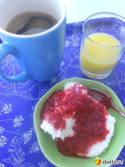 На завтрак у меня были кофе, апельсиновый сок, творог с малиновым пюре: