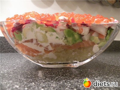 Праздничный слоеный салат из малосольной рыбы (лосося), авокадо, вареного картофеля, свеклы, крабового мяса (или его имитации) и красной икры. Каждый слой промазывают соусом из майонеза и сметаны Читать полностью