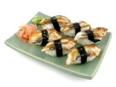шириной примерно 2,5–3 см. Положить на рис по 1 куску угря, слегка прижать пальцами, обернуть полоской нори.
