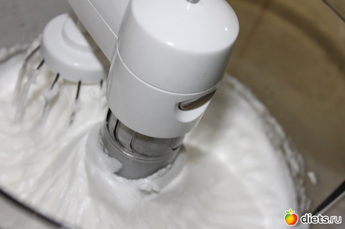 Взбить яичные белки до устойчивых пиков и ввести их в творожно-желтковую массу. О взбивании белков "немало песен сложено", позволю тезисно повторить то, что я соблюдаю всегда. Почти всегда. Посуда. В любом случае обезжиренная (лимонным соком, например) и сухая. Это же касается насадок на миксер. Сырьё. Разумеется, белки должны и намёка не иметь на желтковые вкрапления. Во избежание таковых - каждое яйцо разделяется на составляющие, прошедшие проверку белки выливаются в посуду для взбивания по одному. Комнатная температура. Не охлаждаю белки для взбивания, напротив, выдерживаю их некоторое время при комнатной температуре. Ведь нам нужен положительный и стойкий результат, а не быстро оседающая пена. Скорость. Началу работы соответствуют небольшие обороты миксера, на которых мы превращаем белки в обильную пену (можно предварительно добавить щепотку соли или несколько капель лимонного сока, правду молвить, я так делаю далеко не всегда). После этого скорость увеличиваем до максимальной и взбиваем до получения гладкой, шелковистой, плотной массы, на которой остаются и не падают "пики". Тут важно не перестараться, чтобы взбиваемая масса не стала "комковатой" и не превратилась в сухую пену.