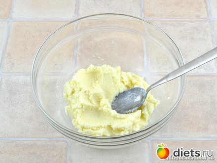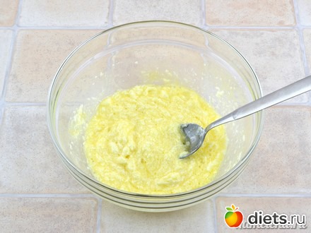 Добавить разрыхлитель и частями муку, каждый раз, хорошо вымешивая ложкой.