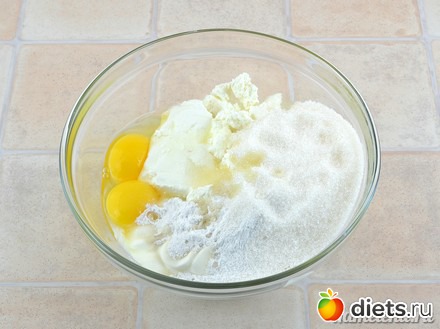 В одну емкость положить творог, сметану, сахар, ванильный сахар, яйца, крахмал, сок половины лимона.