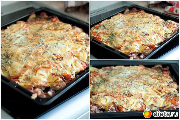 2. Выложить ломтики мяса, лук, тертый картофель, помидоры (смазать майонезом).