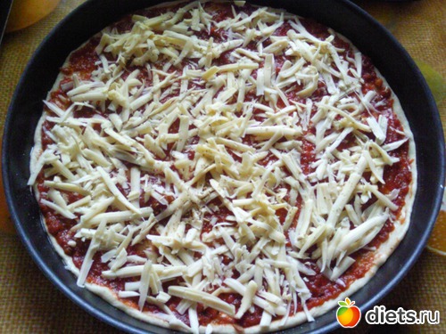 Тесто раскатать по размеру формы и выложить томатную начинку. Сверху посыпать тёртым сыром