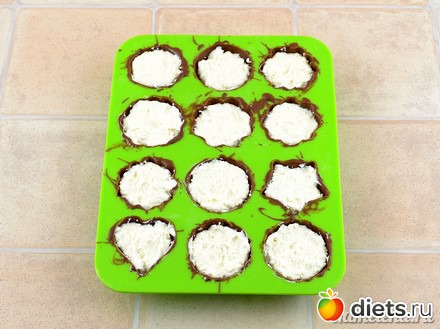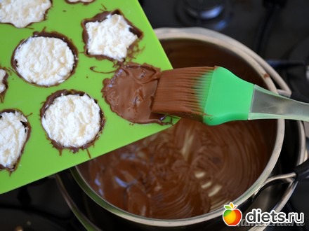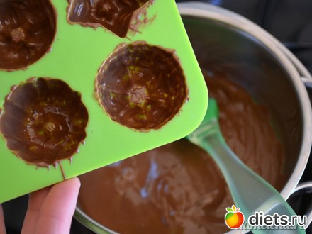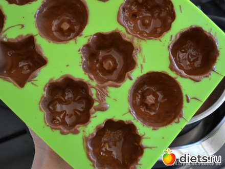 С помощью силиконовой кисточки, смазать шоколадом формочки (останутся просветы – не страшно).