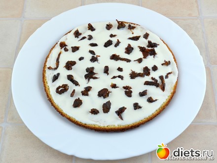 Положить нижний корж на тарелку, обильно смазать сметаной.