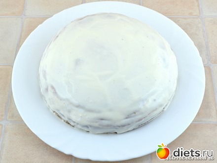 Таким образом собрать весь торт. Промазать сметаной верхний корж и бока торта.