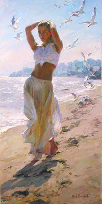 Однажды на горизонте показался корабль. Вглядываясь в очертания его силуэта, Девушка вдруг почувствовала, что он несёт ей беду. Этот корабль действительно принёс ей горе. Впрочем это ещё вопрос, но молодой и прекрасный Принц, который одарил её счастьем и любовью (это тоже вопрос - кто кого?), взошёл на корабль и уплыл в далёкую страну, где его ждали родные и друзья. На прощанье он обещал вернуться за своей нежной белокурой красавицей. И она долго, верно и преданно ждала его, встречая каждое утро на берегу своего любимого моря. Душа её изболелась, а глаза, некогда голубые и бездонные, как это море, выцвели от пролитых слёз по своему возлюбленному. День проходил за днём, месяц за месяцем: тот, которому она отдала всю свою большую любовь, всё не возвращался. И Девушка поняла, что ей нечего больше ждать. Но если разум ей говорил, что она не увидит его более, то сердце стонало, кричало, взывало: «Любимый мой, я жду тебя, я тоскую о тебе, я иду к тебе!» И Девушка пошла по морской зыби туда, куда уплыл корабль, унося её возлюбленного. Она долго шла, простирая руки в голубую высь, в безбрежную даль, как бы стараясь взлететь и преодолеть то синее пространство, которое отделяло её от её прекрасного Принца. Но волны поглотили её, принимая в свои объятия, согревая своей негой, любовью и теплотой, унося в далёкую глубину её страдания и боль. Белые барашки, как напоминание о её прекрасных белокурых волосах, набежали на песчаный берег, смыли её следы и навсегда исчезли в морской пучине. Вот так и встретилась Девушка с истинной своей любовью, которой жила всю жизнь до появления Принца. Что мы знаем о ней?